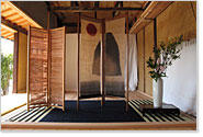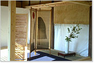 屏風の下敷きには、これも塾生・瀧山雄一さんの倉敷段通が。そして、生け花は塾生・岩本尚子さんの季節の花が生けられ、工事現場であることをしばし忘れるほど、良いしつらえになりました。 |